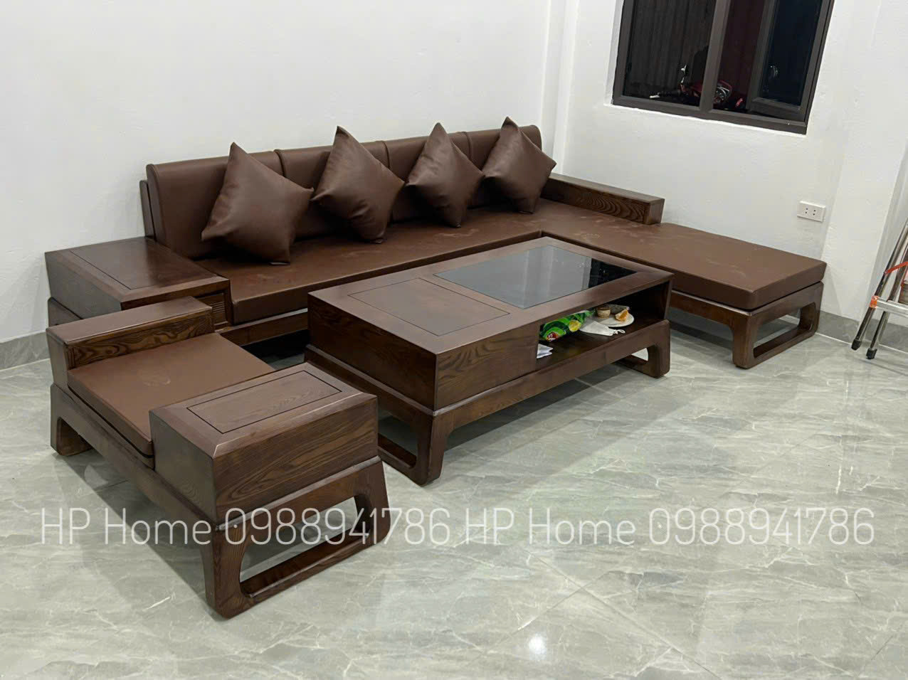 Sofa góc L chân uốn ( kèm đệm da + kính )