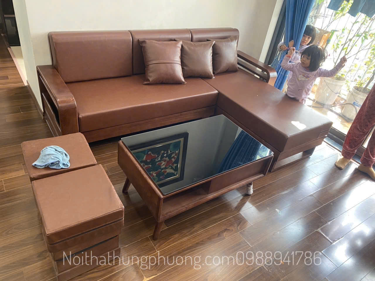 Sofa 2 văng cánh tiên bàn hộp 5 chi tiết ( kèm đệm da+ kính )
